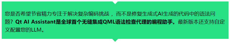 QML語法檢查器也被用于/fix和/review智能命令,為LLMs提供更多上下文。該功能可在Qt Creator的AI Assistant偏好設置中禁用。