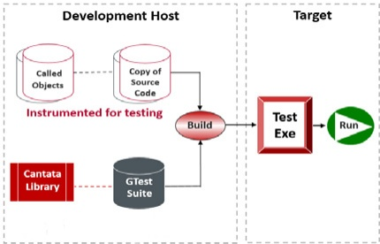 在測試中,源代碼的副本將使用Cantata測試指令和代碼覆蓋率,以確保生產代碼永遠不會因為測試而修改。