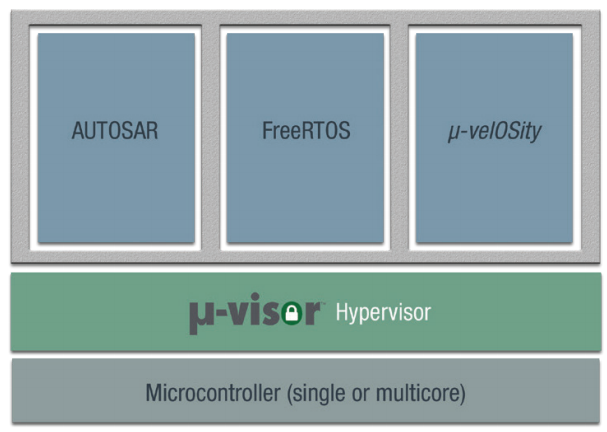 μ -visor使用微控制器上的一個或多個內(nèi)核運行和保護多個操作系統(tǒng)的示例,利用硬件強制分離。微控制器可以是獨立的,也可以是較大SoC的一部分。