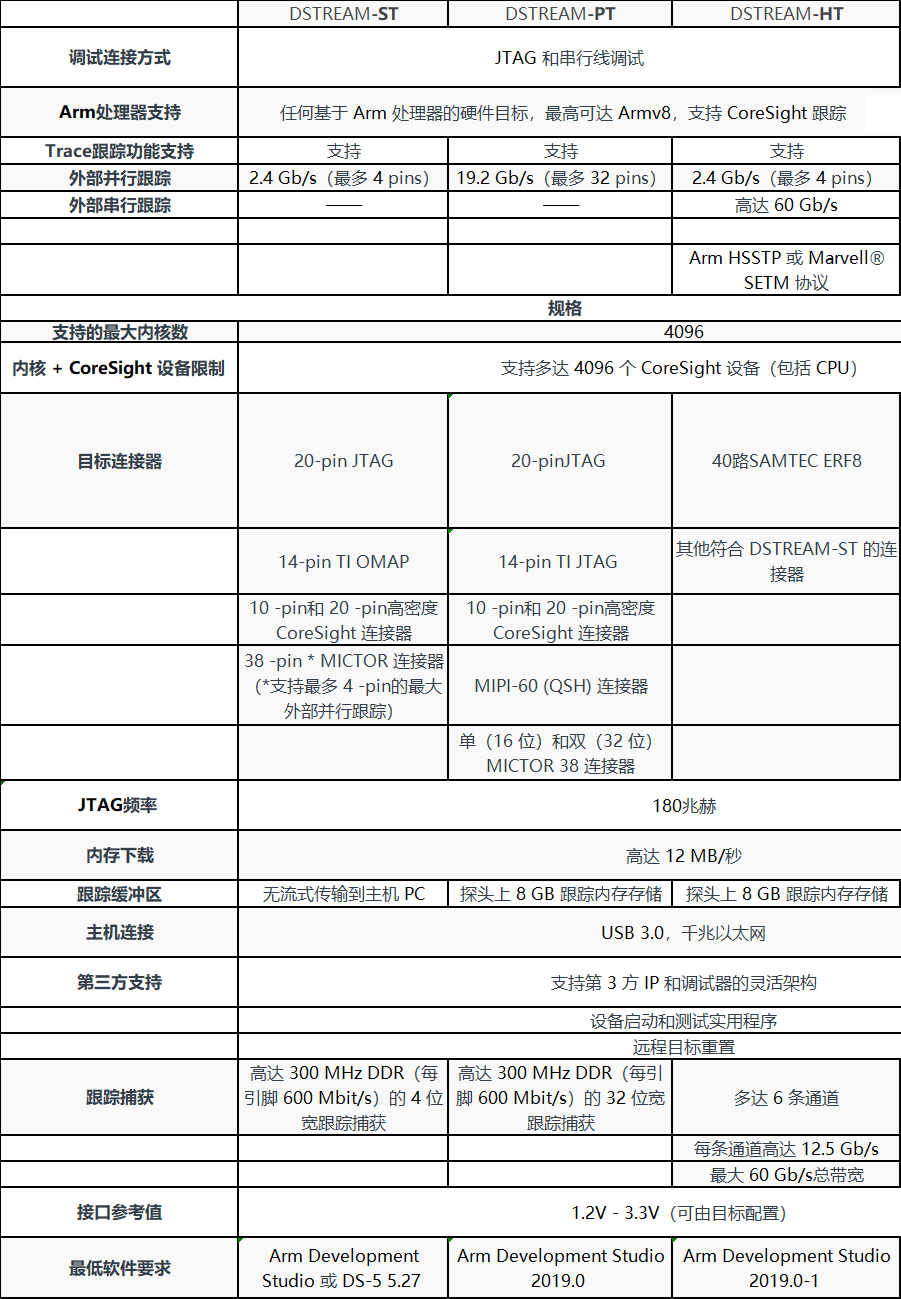 DSTREAM按性能的不同,分為DSTREAM-ST、DSTREAM-PT、DSTREAM-HT三種類型。各類型的性能如下表:
