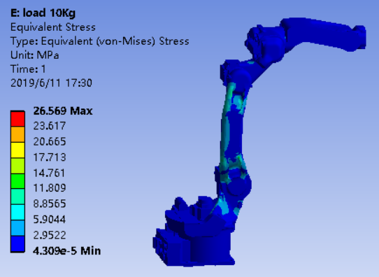 · 機器人手臂應力分析 以機器人手臂為分析對象,采用軟件ANSYS Mechanical,計算得到六自由度機器人某姿態(tài)下無負重與負重10Kg兩種情況下整機應力分布。
