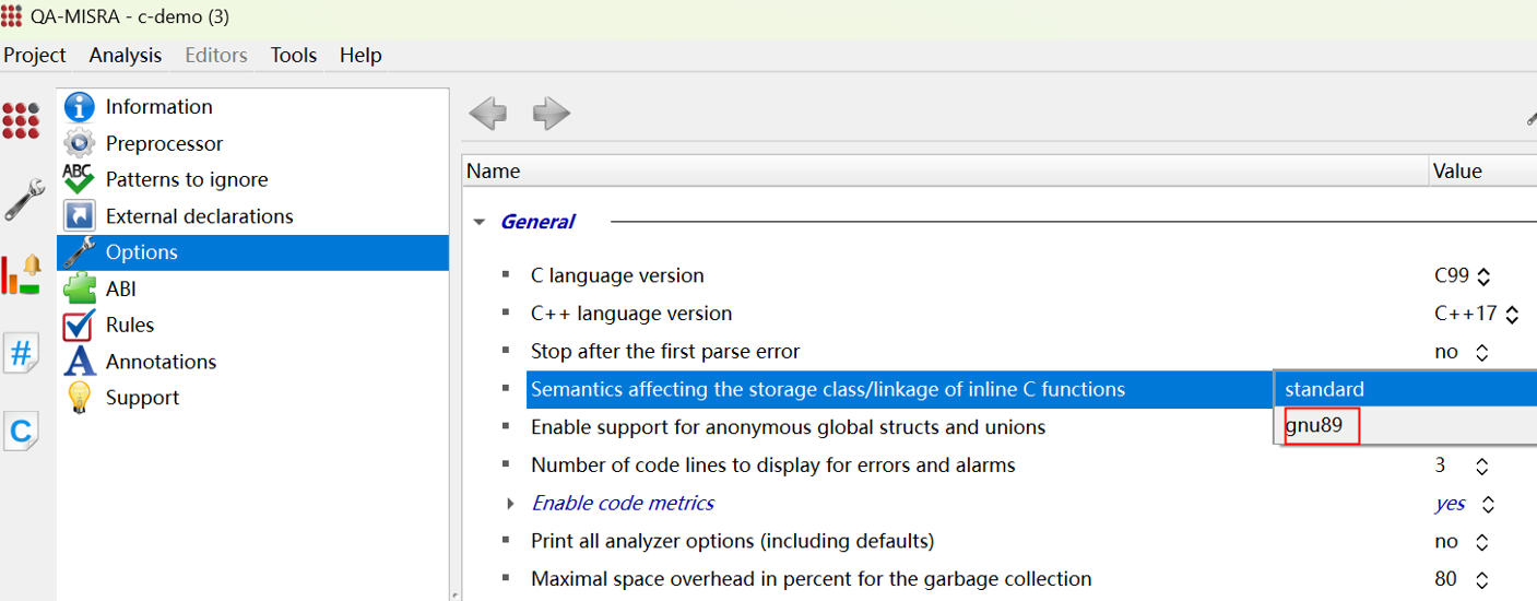 2、在Setting頁面選擇Option Tab頁,General頁面Semantics affecting the storage class/linkage of inline C functions一項,雙擊選擇gnu89;(圖2-1)