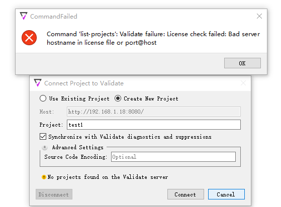 在QAC的圖形化界面中連接Validate創建View工程,出現報錯 ?“Command 'ist-projects’: Validate failure: license check failed: Bad serverhostname in license file or?port@host”