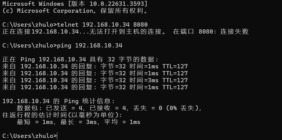 服務器機器telnet 192.168.10.34 8080沒有權限,可以ping通,有正常的網絡連接。