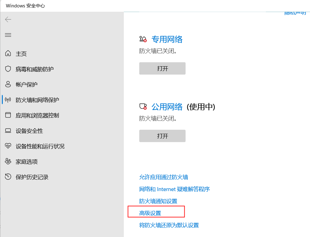 1)、在客戶端機器上打開“防火墻和網絡保護設置”、點擊“高級設置”。