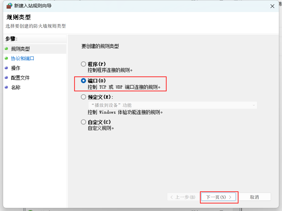 3)、進入“新建入站規則向導”、選擇“端口(o)”、再點擊“下一頁(N)”