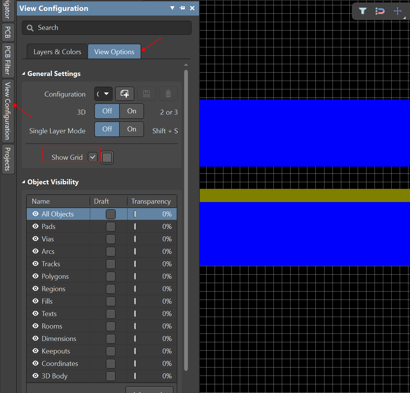 PCB設(shè)計(jì)中,可以對(duì)柵格進(jìn)行設(shè)置大小,用以輔助布局布線。有時(shí)候因?yàn)檎`操作會(huì)把柵格隱藏,或者拿到別人做的PCB文件進(jìn)行修改,原設(shè)計(jì)人員將柵格隱藏了,又不知道怎么設(shè)置才能顯示柵格;
