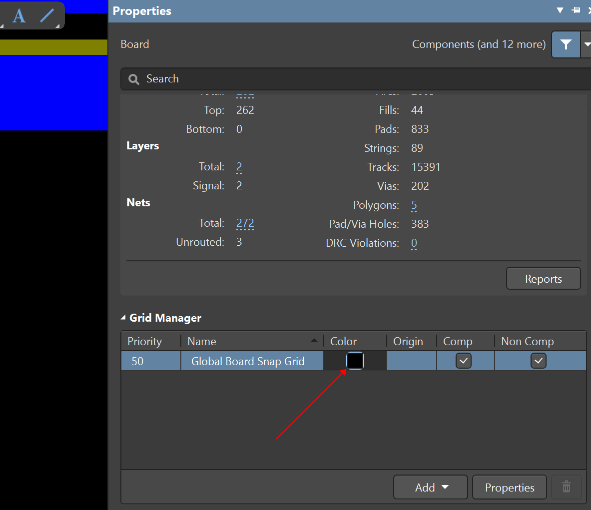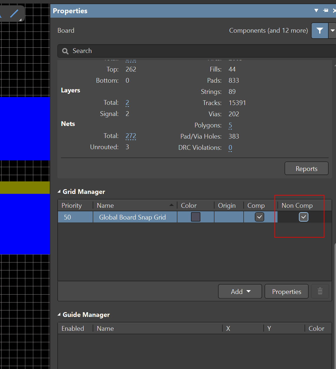 3)、在Board屬性中找到Grid Manager,查看"Non Comp"是否打勾,打勾顯示柵格,取消打勾不顯示柵格,如圖3。此處設(shè)置直接受1、2兩處影響,當(dāng)1、2兩處設(shè)置為不顯示,在此處勾選了也不會(huì)顯示柵格。