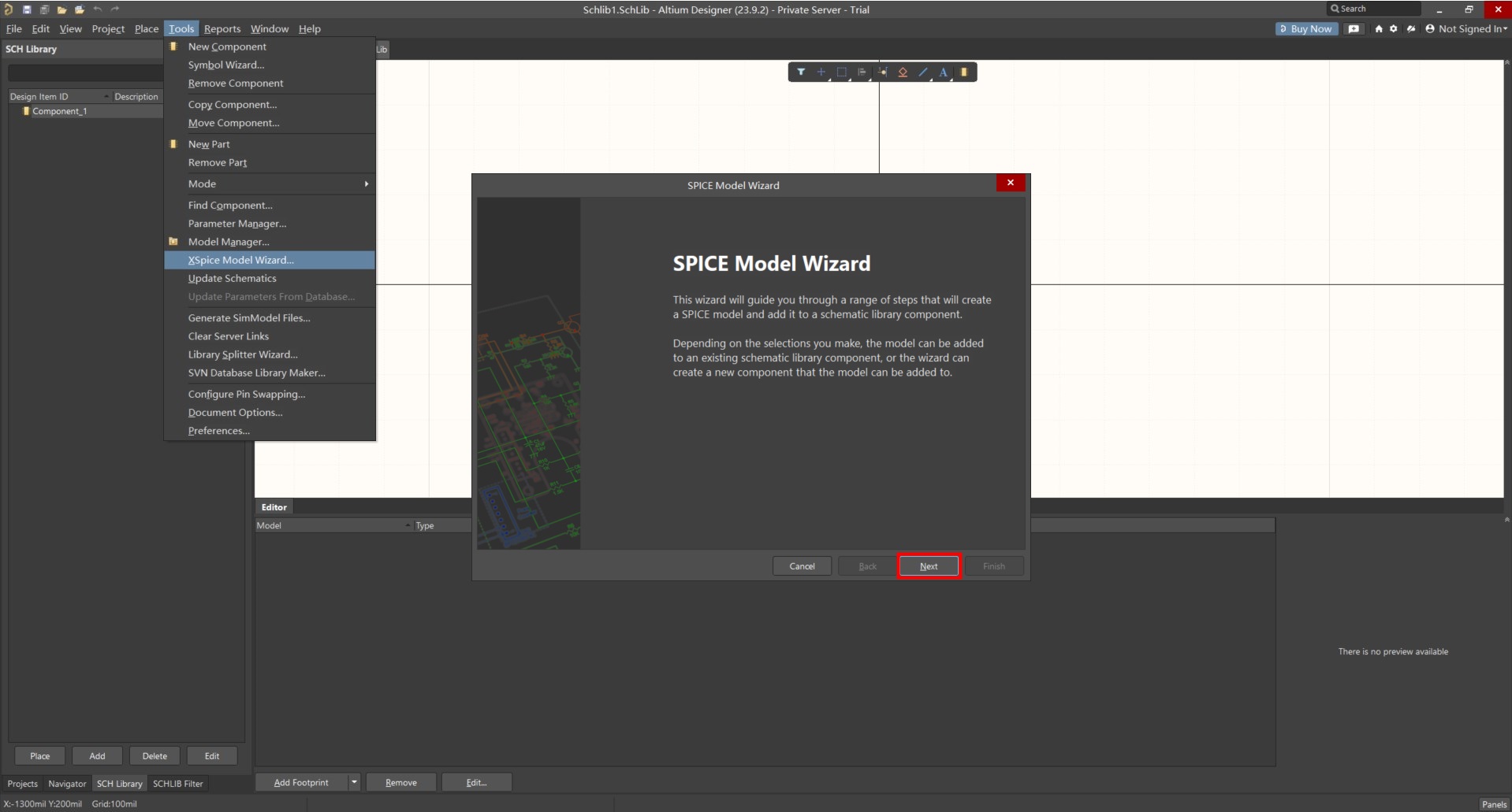 3. 在 AD 主界面主菜單下選擇 Tools → XSPICE Model Wizard。如圖 2 所示,出現 SPICE Model Wizard(SPICE模型向導)對話框。