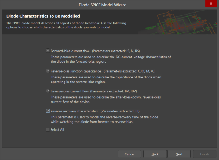 7. 單擊 Next 按鈕。如圖 6 所示,出現 Diode Characteristics To Be Modelled(所建模二極管的特性)對話框。勾選以下所要創建的二極管模型特性根據數據手冊進行填寫特性數據。