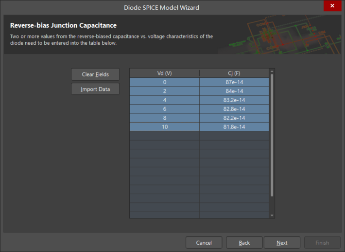 單擊 Next 按鈕。如圖 9 所示,出現 Reverse-bias Junction Capacitance(反向偏置結電容)設置對話框。按照 1N4148 手冊所示,輸入 Vd-Cj 的關系。