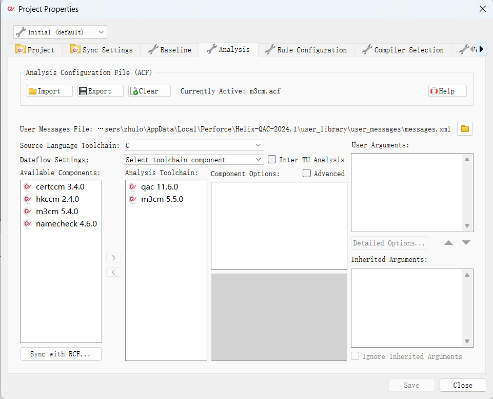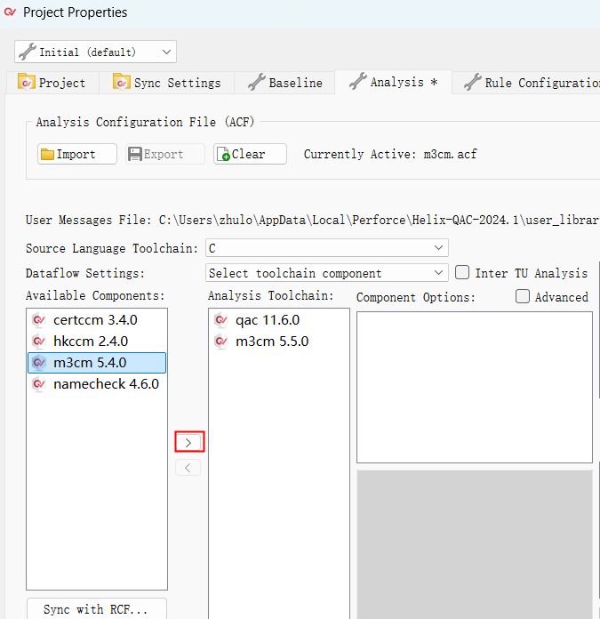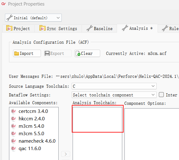 4.默認情況下,面板中已提供主要分析器,例如?Helix QAC for C?和?Helix QAC for C++?(qac 11.6.0qacpp 6.6.0)。輔助分析組件位于左側的Available Comonents窗口中,如果組件需要成為當前分析的一部分,則可以使用“>”按鈕將其添加到Analysis Toolchain中;相反,可以使用“<” 按鈕將其刪除。