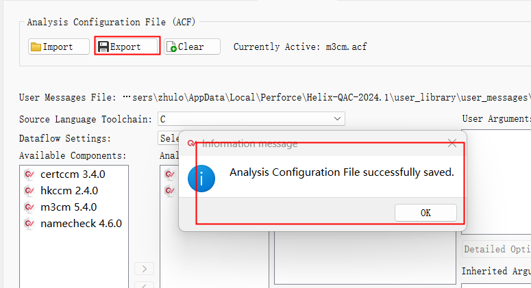 2.點擊“Export"可以將目前使用Analysis Toolchain的配置文件進行保存為.acf格式進行輸出、方便公司內部自定義規則的保存和傳閱。