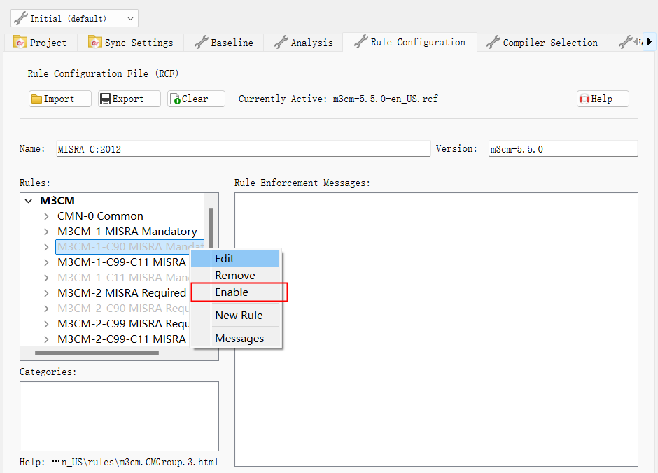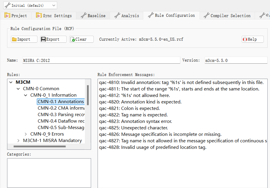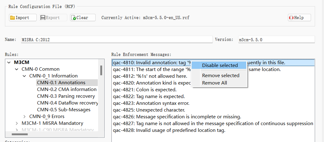 5)、點擊進入“Rule Configuration”,這里可以看到JNH官網剛剛選擇的M3CM的具體細則,規則檢查需要報出哪些消息。RCF文件也支持Import導入、Export 導出、Clear清除等相應操作。