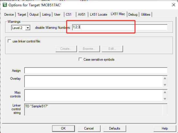 4)、在LX51 Misc中還可以將指定的警告信息進行屏蔽,將工程師認為不會影響功能實現(xiàn)的警告信息進行直接屏蔽,如圖4-4所示。