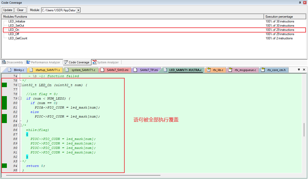1)、圖4-1是對(duì)于LED_On函數(shù)的代碼覆蓋率檢測(cè)。從圖中可以看到對(duì)應(yīng)函數(shù)的代碼覆蓋率是100的。