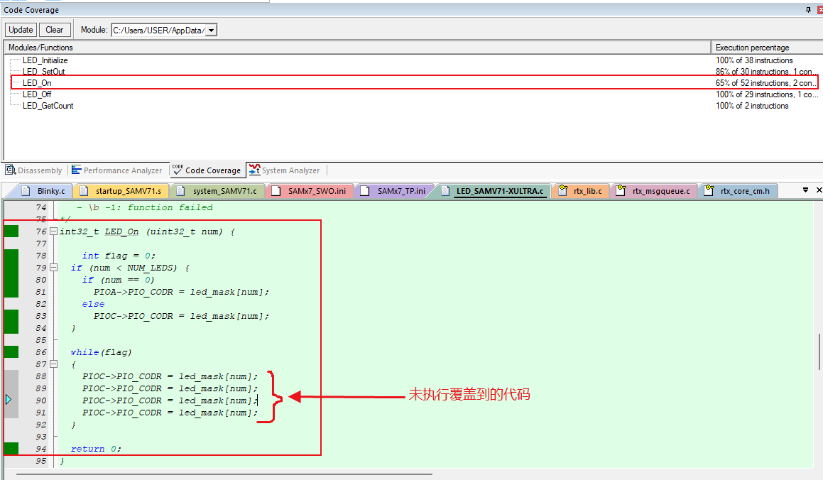 2)、然后,對(duì)于LED_On這個(gè)函數(shù)進(jìn)行修改,添加一些不會(huì)被執(zhí)行的代碼進(jìn)入,如圖4-2。圖中顯示可以看到有四個(gè)語(yǔ)句是未被執(zhí)行的。在代碼覆蓋率的窗口中LED_On這個(gè)函數(shù)的代碼覆蓋率只有65了。