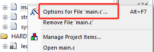 1)、如果需要對于單文件進行單獨的選項配置的話,就選中對應的源文件,然后,右鍵在打開的菜單中選擇Options for File ‘main.c’。(如圖4-1)