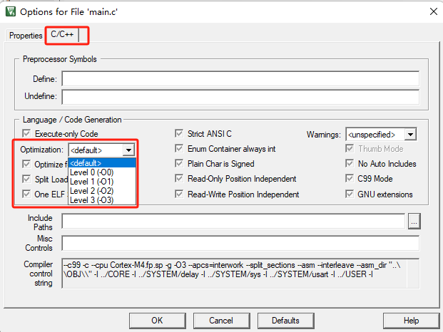 2)、然后,在打開的Options for File ‘main.c’窗口中,切換到C/C++欄,在Optimization中去選擇優化等級(如圖4-2)。“<default>”選項是默認使用整個工程采用的優化等級。選擇“Level 0/1/2/3”就是將對應的源文件使用O1/2/3優化等級去進行構建。