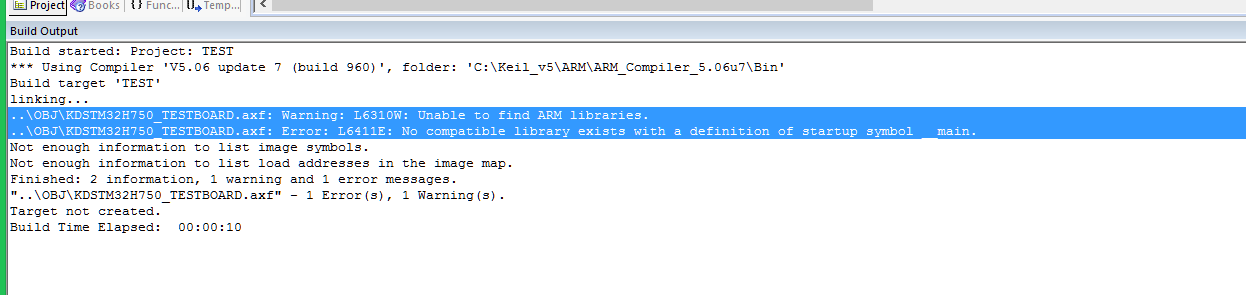 在MDK進行構建工程的時候,出現提示“Warning: L6310W: Unable to find ARM libraries.”的警告信息。