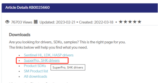 2、解決方法就是在加密狗的驅動官網下載 在網頁上找到 Drivers and_Downloads-> SuperPro, SHK drivers (如圖4-2-1和圖4-2-2),然后下載Sentinel Protection Installer Version 7.5.0 (Installer Only)這個版本的驅動程序進行安裝。