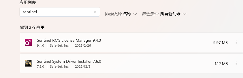 3、安裝前需要先卸載之前安裝過的驅動程序??梢栽陔娔X的應用列表中搜索sentinel,找到驅動程序進行卸載。(如圖4-3)